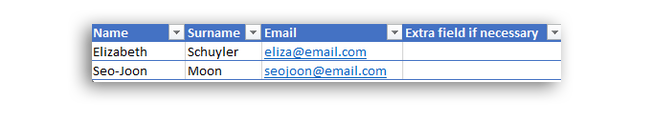 If any extra information is requested in the registration form, such as department, position and / or city, they must be added with the exact name in the Excel column.